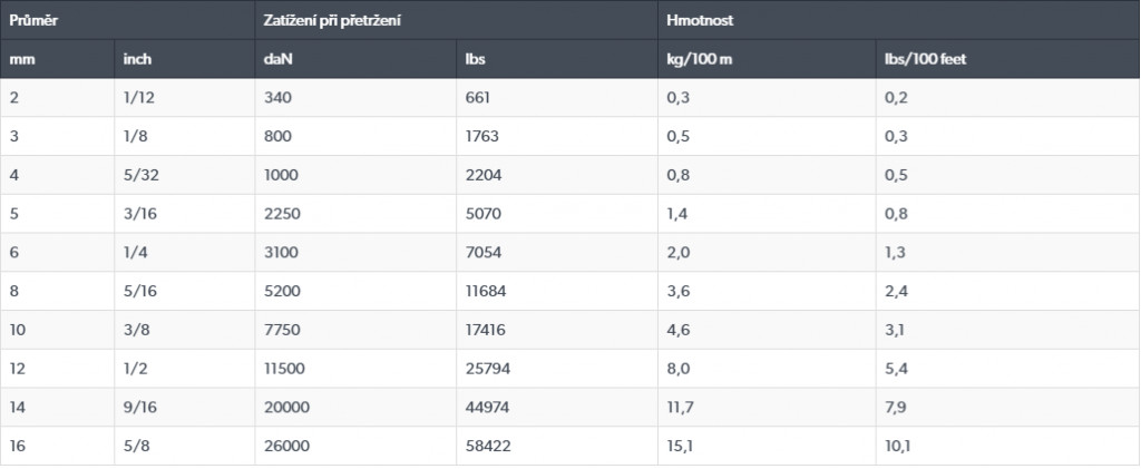 Maximální tažnost lana je 2 % při 30 % přetržené síly.