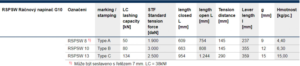 Přípustná tažná síla je o 25 % vyšší než u kotevních řetězů v pevnostní třídě G8. Upozorňujeme, že ráčnový napínač nesmí být používán pro zvedání břemen.