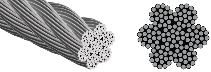 - Nerezové lano konstrukce 7x19 má 7 pramenů, po 19 drátech, z materiálu AISI 316