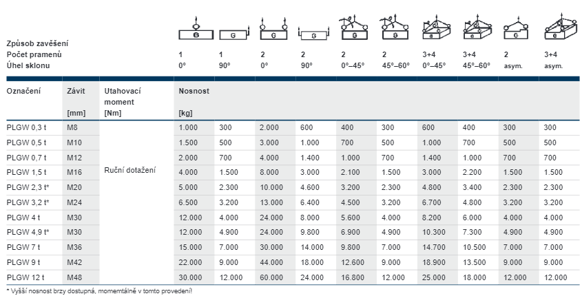 Pro náklad o nosnostech v povolených směrech použití, viz tabulka nosností na následujících stránkách. Nastavte vázací bod před zvedáním do povoleného směru tahu.