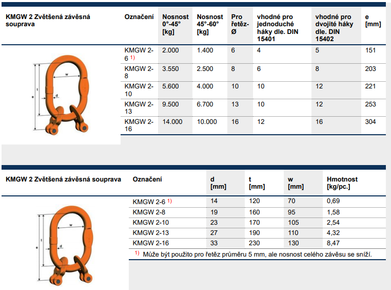 Tako sestava se zvětšenými rozměry oka je vhodná pro další velikosti jeřábových háků.