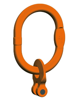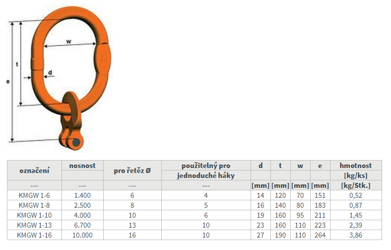Pro jeřábový hák. Vysokopevnostní souprava sloužící k vytvoření 1pramenného montovaného řetězového závěsu. Řetěz je montován přímo do spojky oka a není potřeba žádného dodatečného spojovacího článku.