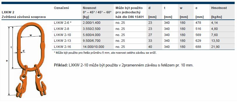 Zvětšená zavěšovací souprava se zkracovacími háky se často používá pro jeřábové háky. Slouží pro vytvoření 2pramenného montovaného řetězového závěsu. Řetěz je montován přímo do zkracovacího háku a není potřeba žádných dodatečných spojovacích článků.