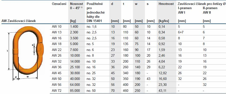 Vhodný také jako koncový článek typ AI, viz tabulka max. velikostí háků dle DIN 15401 a DIN 15402 níže.