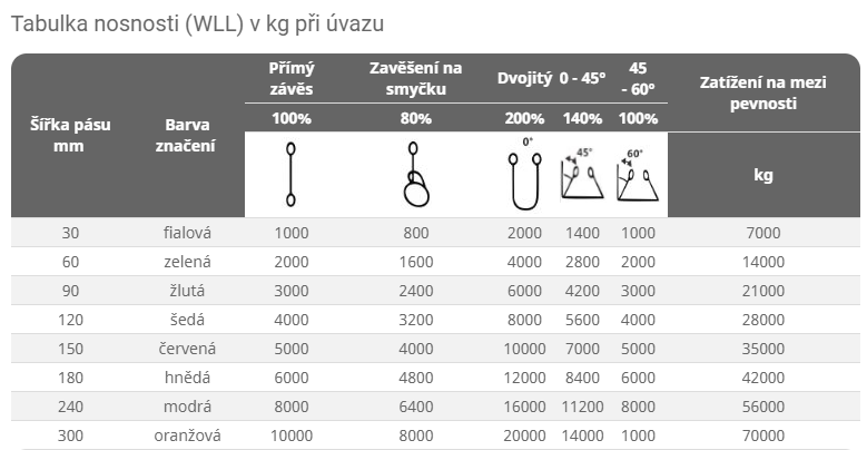 - počet pruhů na popruhu odpovídá nosnosti v přímém zavěšení /1pruh = 1t/